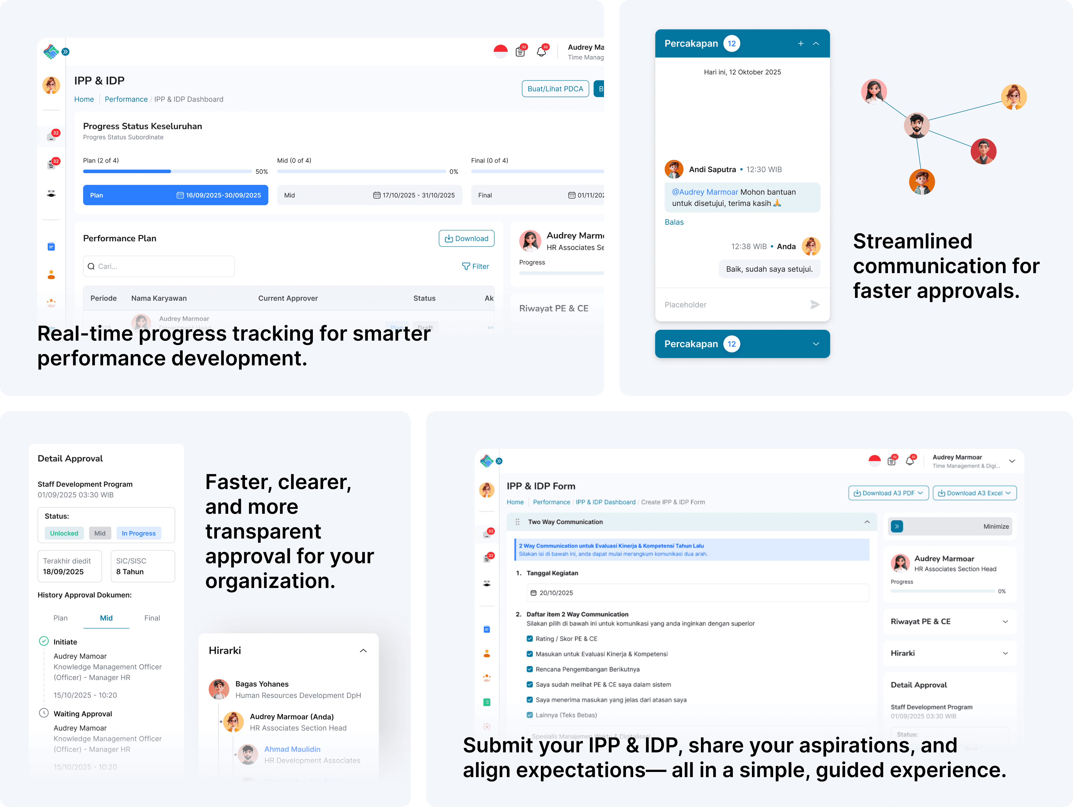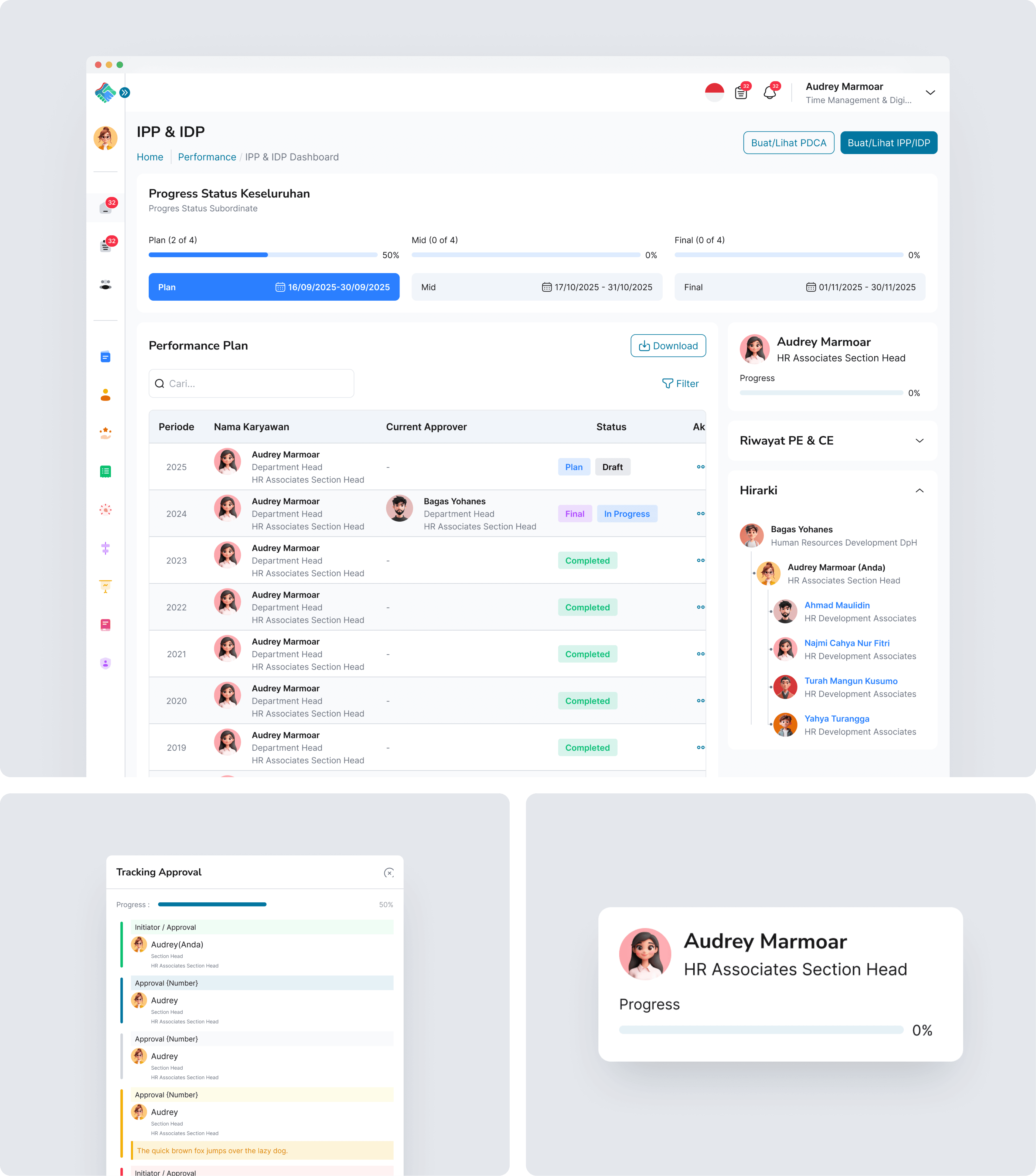 IPP & IDP Dashboard is a monitoring dashboard for HR to oversee the implementation of employees’ Individual Performance Plans and Individual Development Plans. It enables HR to track progress across each evaluation phase, monitor approval statuses, review performance plan history per employee, and understand organizational hierarchy, ensuring performance evaluation and employee development processes are well-controlled, consistent, and transparent.
