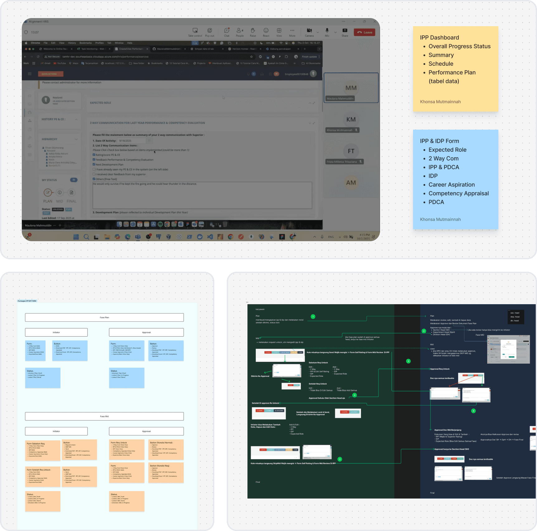 At Toyota Astra Motor, HRIS is a centralized digital platform that supports end to end employee management, from workforce planning and performance tracking to career development. The system functions as the backbone of HR operations, ensuring that all processes remain standardized, transparent, and aligned with company policies. As organizational needs expanded, HRIS evolved into two main modules: Performance Management and Organization Management. This project focuses on the Performance Management module, which consists of two key submenus: IPP (Individual Performance Plan) and IDP (Individual Development Plan). These processes run through three core phases: Plan, Mid, and Final. However, the current dashboard and forms still present several usability issues: the forms appear too long, the information structure lacks clarity, and certain sections are difficult for users to understand. These issues significantly increase *time to complete* and add unnecessary cognitive load, making the input, review, and decision making processes slower and less efficient. To address this, a revamp is being carried out to simplify the interface, improve information hierarchy, and create a more intuitive user flow. Overview of the phases: - Plan Phase: The Initiator (employee) completes the IPP and IDP based on performance targets and development needs, including the Career Aspiration section (rotation and mobility preferences). Once completed, the form is submitted to the approver (HR/Section Head, Dept Head, Div. Head) for review, approval, or revision. - Mid Phase: The mid-year phase is used to monitor the progress of IPP and IDP. Adjustments can be made if necessary, based on discussions between the initiator and the approver. - Final Phase: The final phase includes a comprehensive evaluation of individual performance and development outcomes. The approver conducts the final assessment, which becomes the basis for managerial decisions such as promotions, advanced training assignments, or future career planning. With this revamp, the Performance Management module is expected to become more user friendly, clearer in its information structure, and more effective in supporting employee development and strategic decision making.