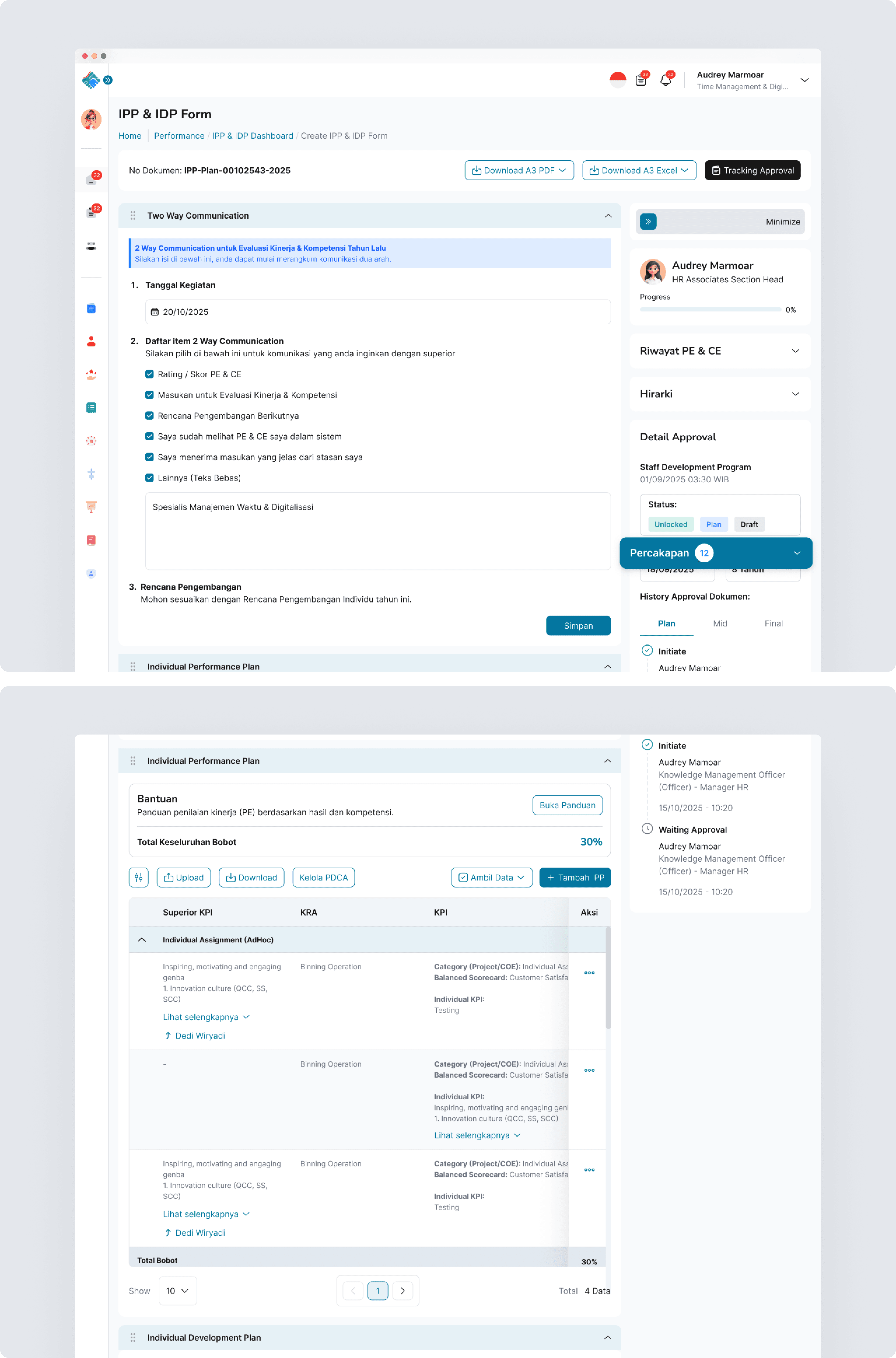 This image represents the IPP & IDP Form page from the employee’s point of view, where employees submit their Individual Performance Plan and Individual Development Plan. Through this page, employees can define performance and development goals, engage in two-way communication with their supervisors, and submit performance and competency evaluations in a structured flow, with clear visibility into KPI details, weight distribution, approval status, and approval history to ensure a transparent and well-documented submission process.